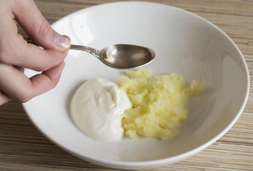 - Sử dụng lòng trắng trứng gà trộn đều với khoai tây cho đến khi hỗn hợp đạt đến độ sánh mịn.