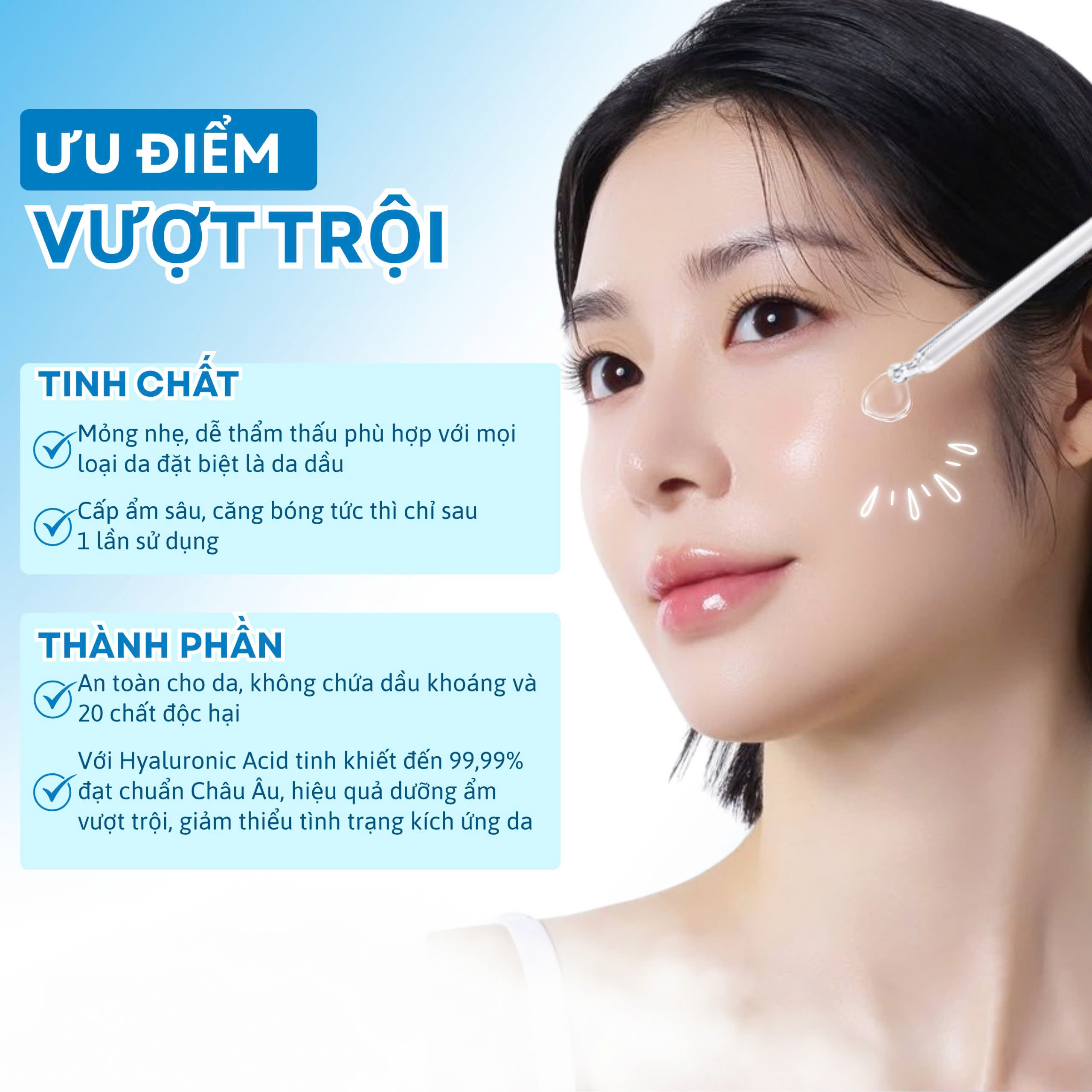 Sự kết hợp của serum Hyaluronic Acid với các phân tử siêu nhỏ giúp serum cấp ẩm phục hồi da thẩm thấu sâu vào từng tầng biểu bì da, cấp nước tức thì và duy trì độ ẩm tối ưu suốt 36 giờ liên tục. Da căng mọng, ẩm mượt cả ngày mà không lo bóng dầu hay bết dính. Hoạt động như serum cấp ẩm serum cấp nước túc thì cho làn da, còn được mệnh danh là serum HA B5.