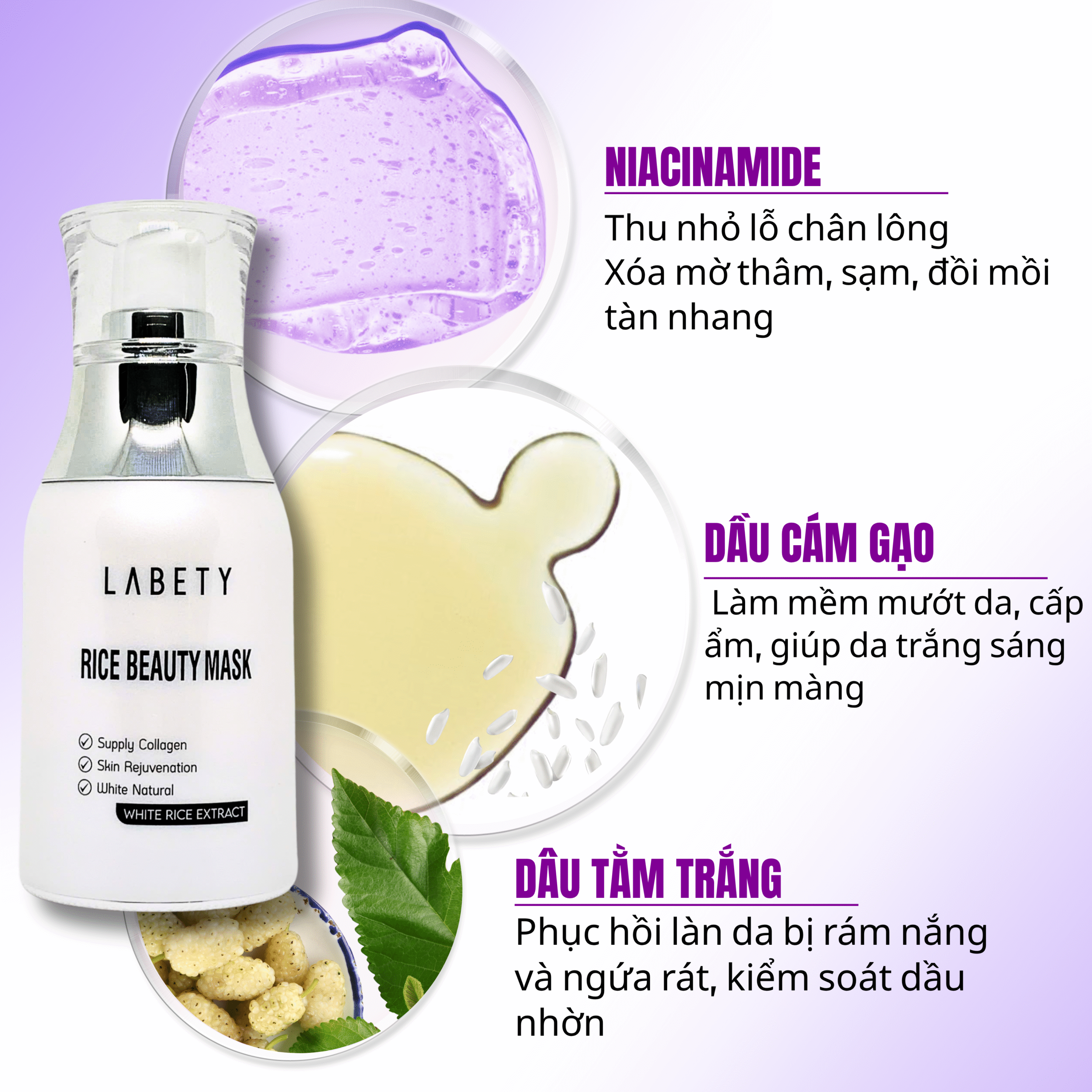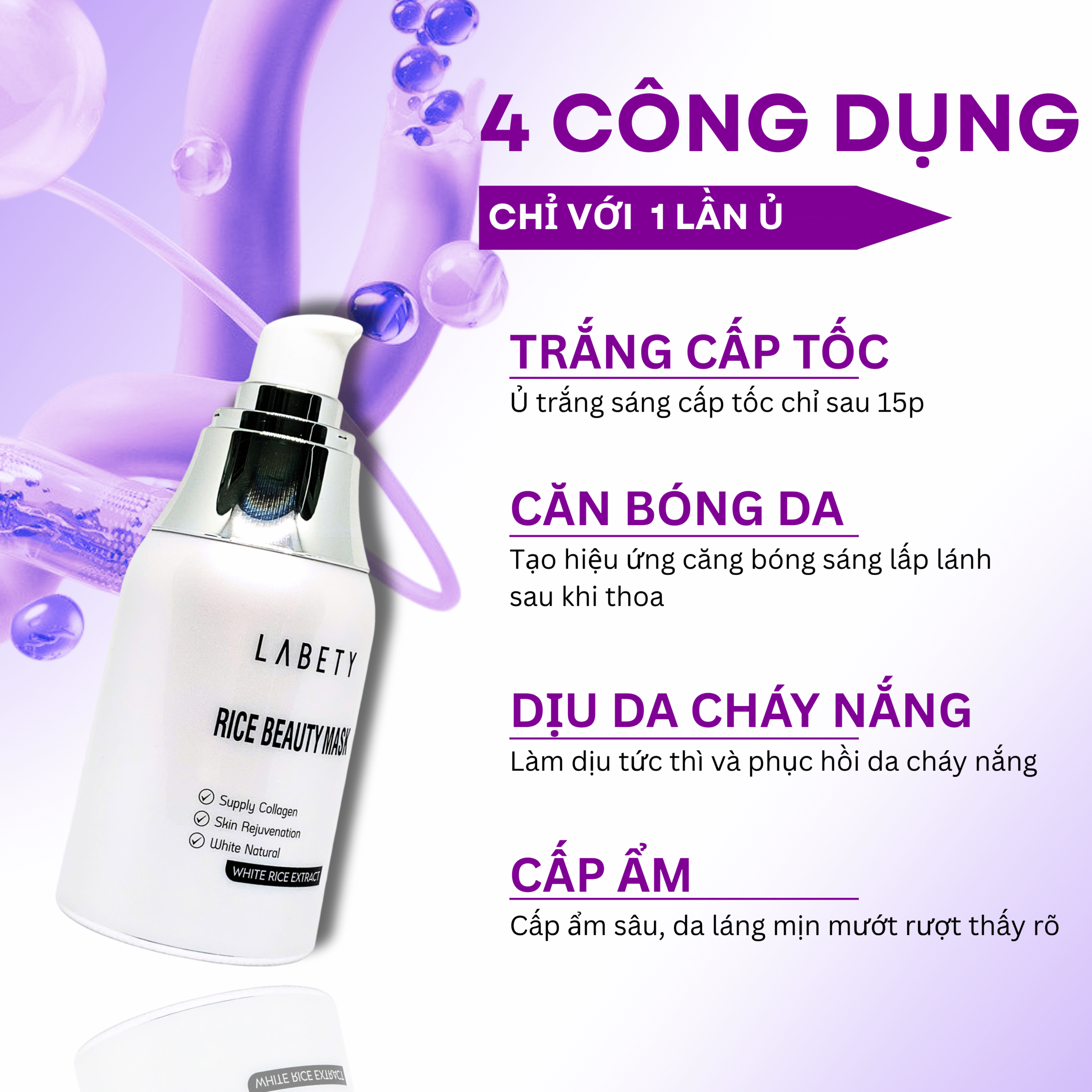 Ủ trắng meso Rice Beauty Mask là sản phẩm mặt nạ dành cho da mặt messo căng bóng trắng da và nâng tông da tức thì từ sau lần đầu tiên sư dụng. Ứng dụng công nghệ ủ trắng meso dạng bôi không kim, không xâm lấn, không gây đau đớn. Mô phỏng 99% công nghệ meso peel đắt đỏ, hiện đại nhưng độ an toàn và lành tính X2 lần so với phương pháp messo căng bóng dùng kim.